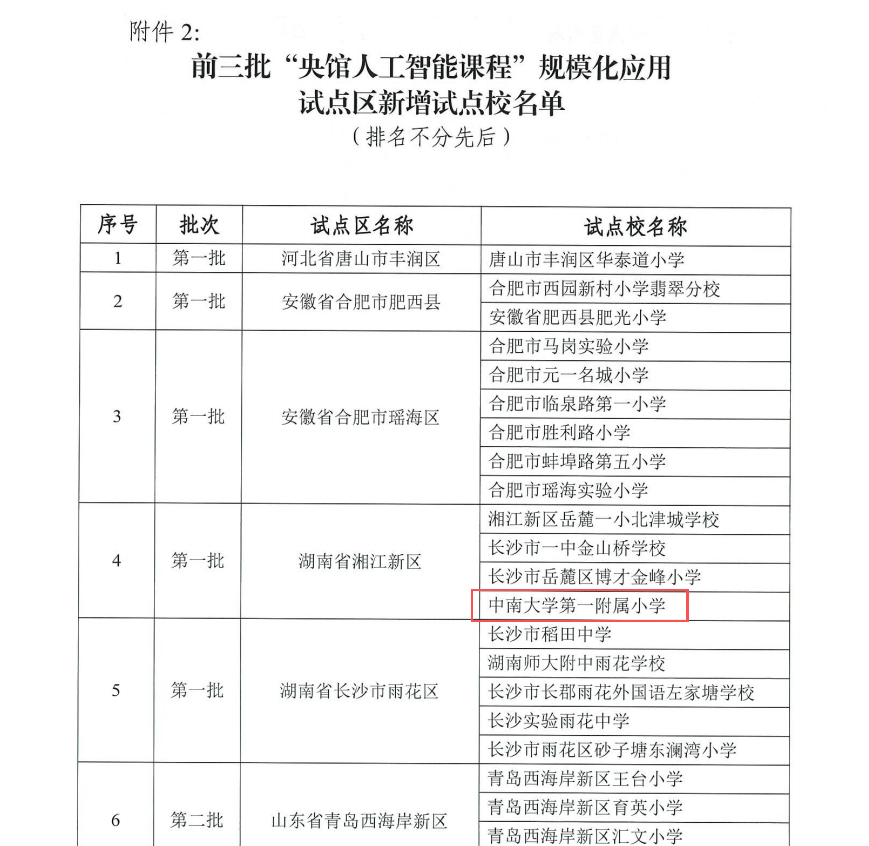 近日,教育部教育技术与资源发展中心正式公布第四批“央馆人工智能课程”规模化应用试点区(含试点校)及前三批试点区新增试点校名单。中南大学第一附属小学成功入选,成为全国首批“央馆人工智能课程”规模化应用试点校之一。