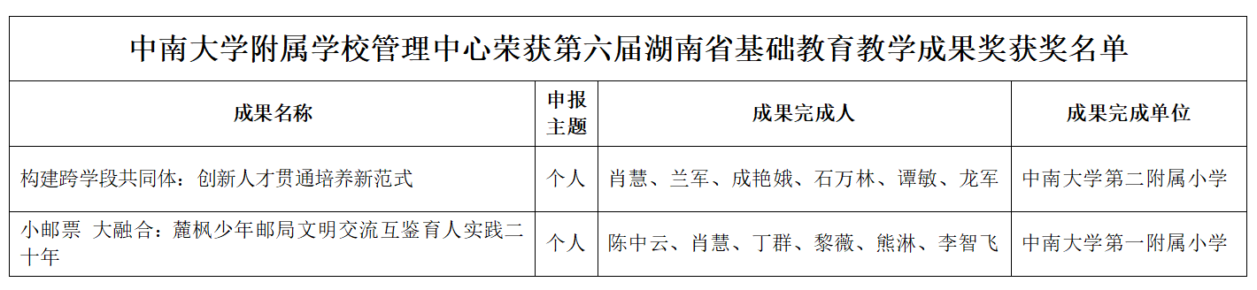 近日,湖南省第六届基础教育教学成果奖揭晓,我校附属学校申报的两项成果均荣获一等奖。该奖项是省级基础教育的最高行政荣誉,彰显了附属学校在“大中小”贯通培养、“邮文化+”育人等领域的深厚积淀。